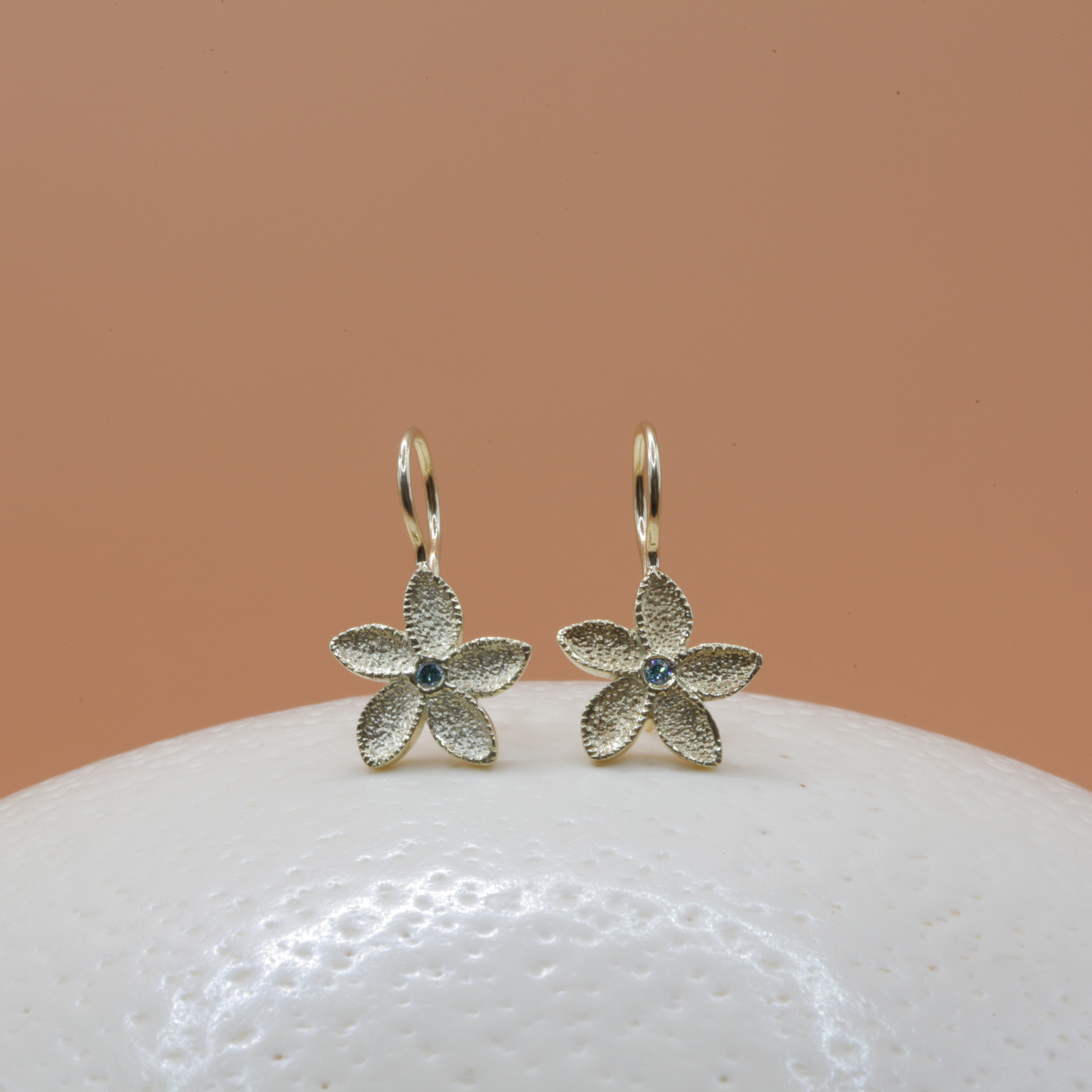 These elegant floral earrings feature five richly textured petals that create a soft, organic shimmer, paired with a sleek hook design for a refined and naturally graceful look.