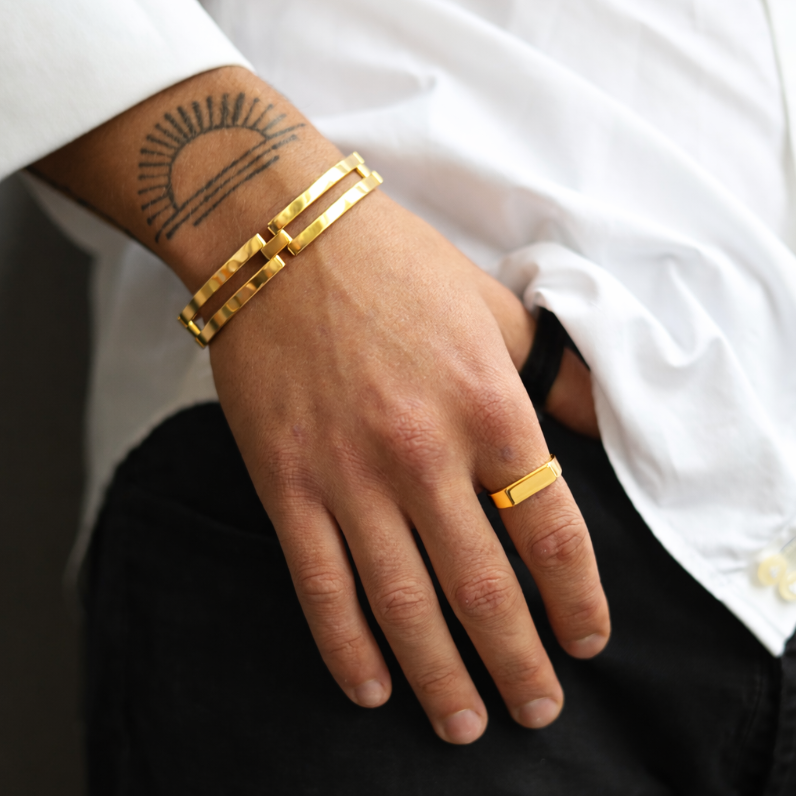 A bold, architectural bracelet featuring sleek parallel bars connected by smooth hinged links, creating a modern, structured silhouette that moves comfortably with the wrist.