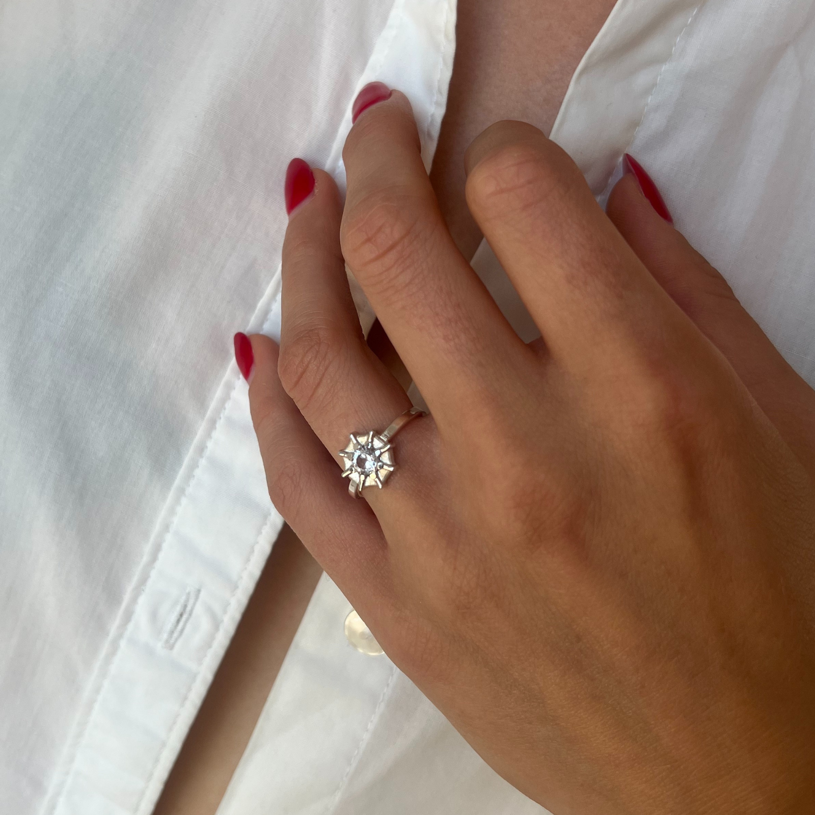 A bold statement ring featuring a brilliant round gemstone set within a sculptural, starburst-inspired frame that radiates strength and modern elegance.