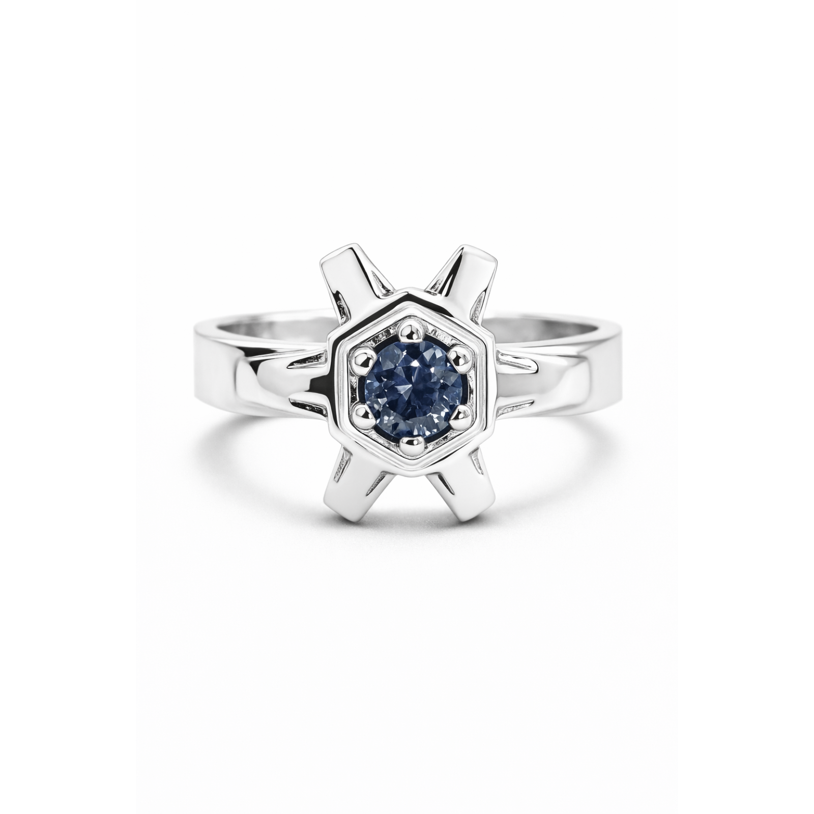 A distinctive ring showcasing a round gemstone set within a hexagonal frame and bold, angular spokes, combining industrial precision with contemporary elegance.