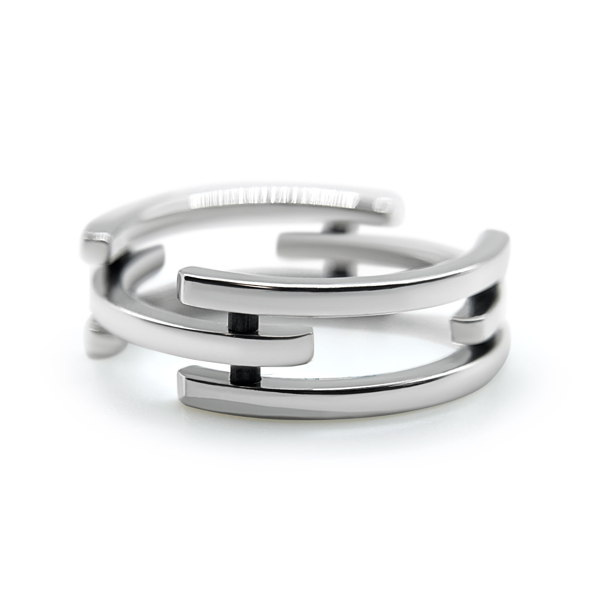 A striking open band ring featuring interlocking curved elements, with two parallel beams facing forward, creating a dynamic, shape-shifting design.