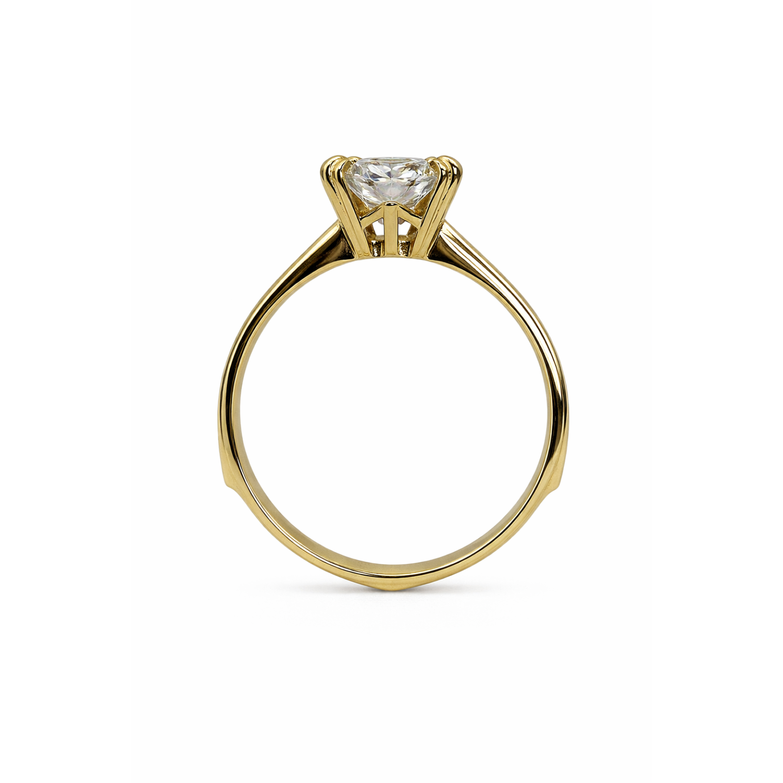 A classic solitaire ring featuring a brilliant round center stone in a sculpted four-prong setting, paired with a subtly contoured shank that adds a refined, modern touch.